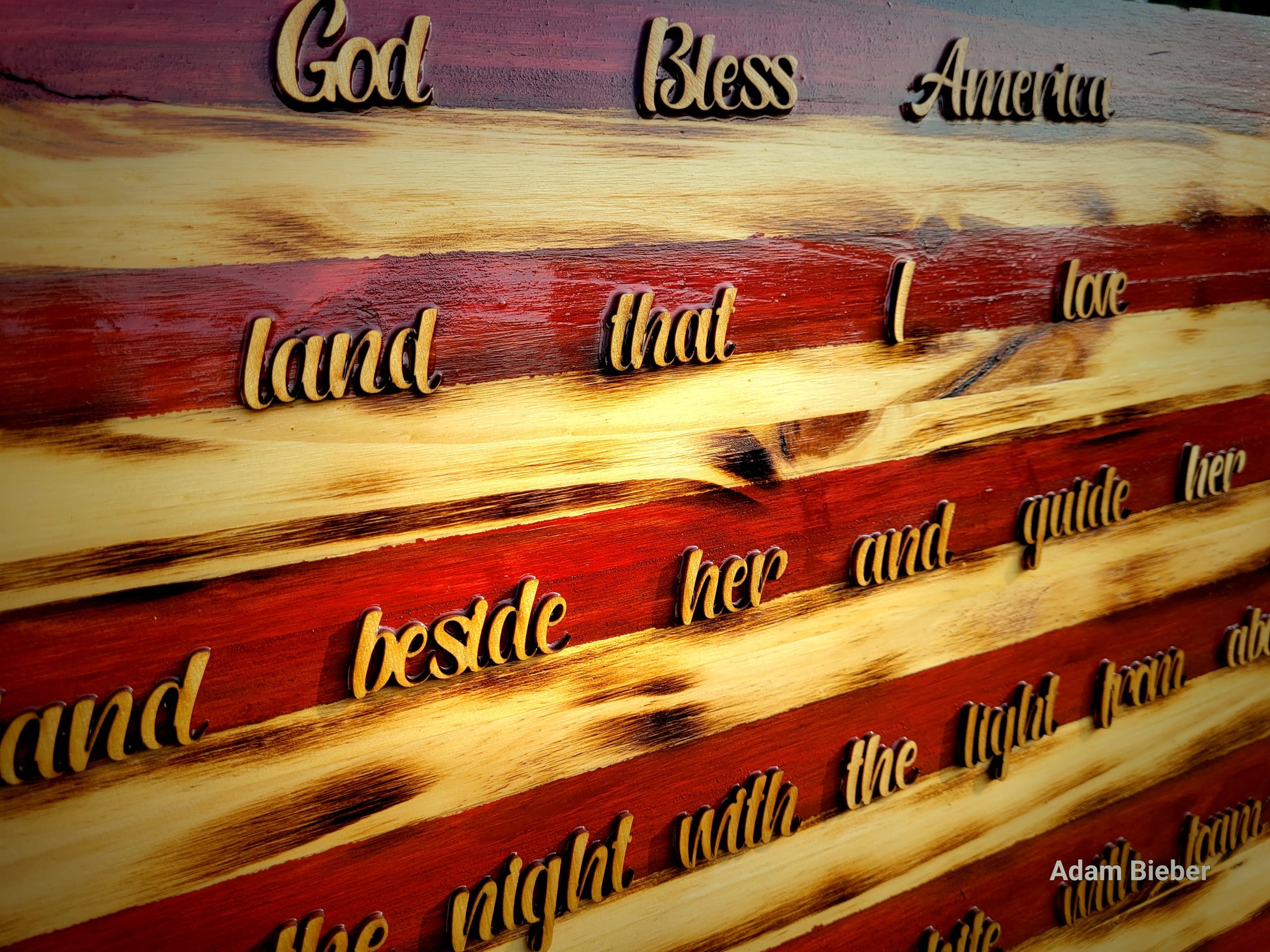 God Bless America lyrics on our traditional American Flag. This is only available in 19"x36" or 24"x48". Flag is sealed with protective sealant but still should be displayed under some cover. It comes ready to display with a hanger in the back.
