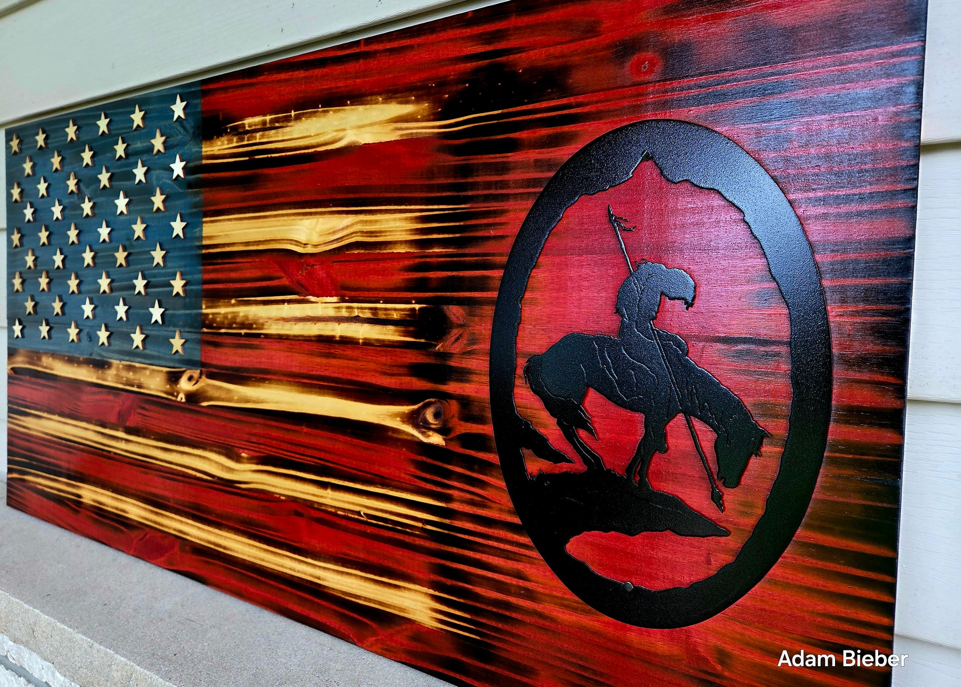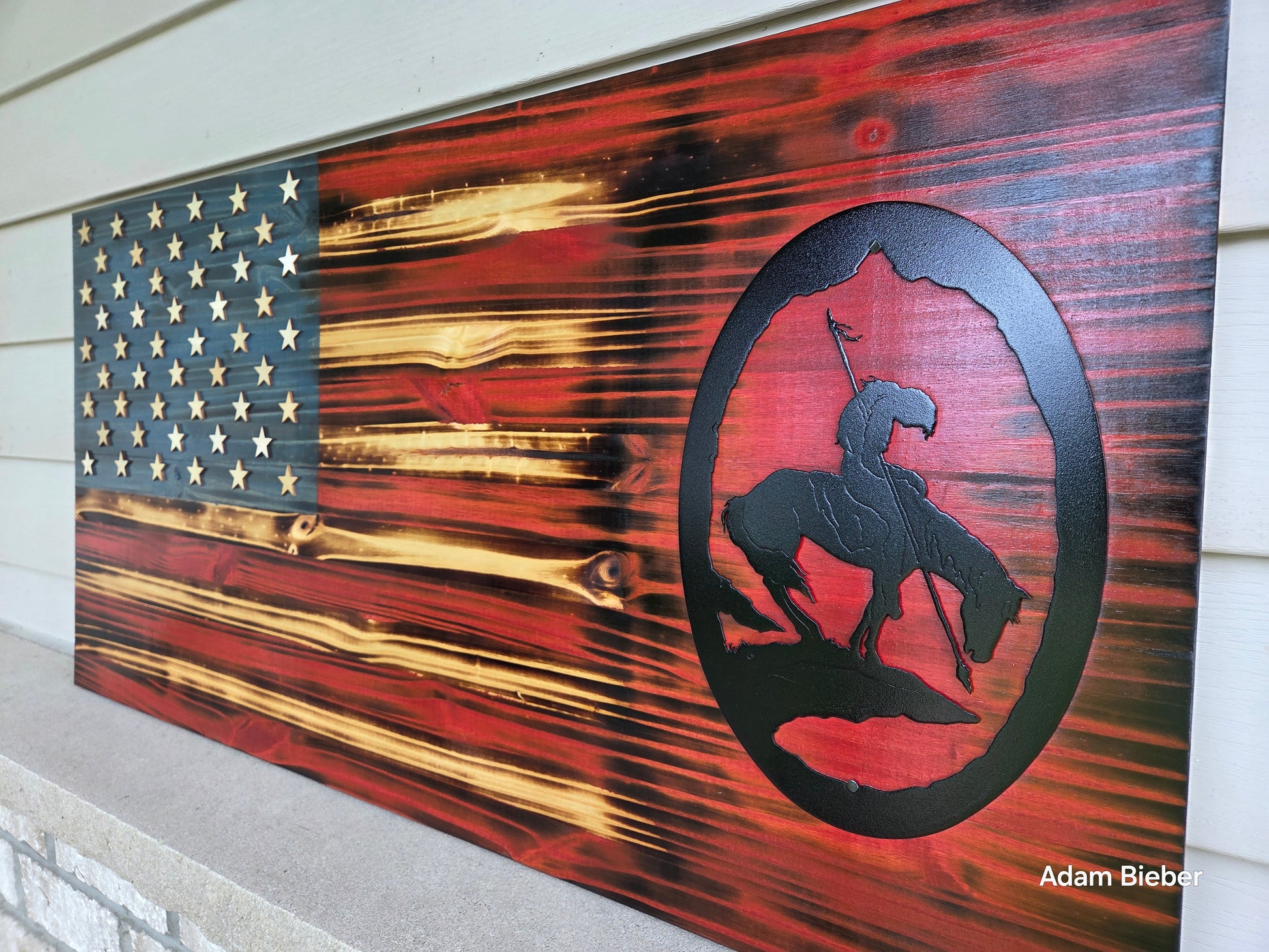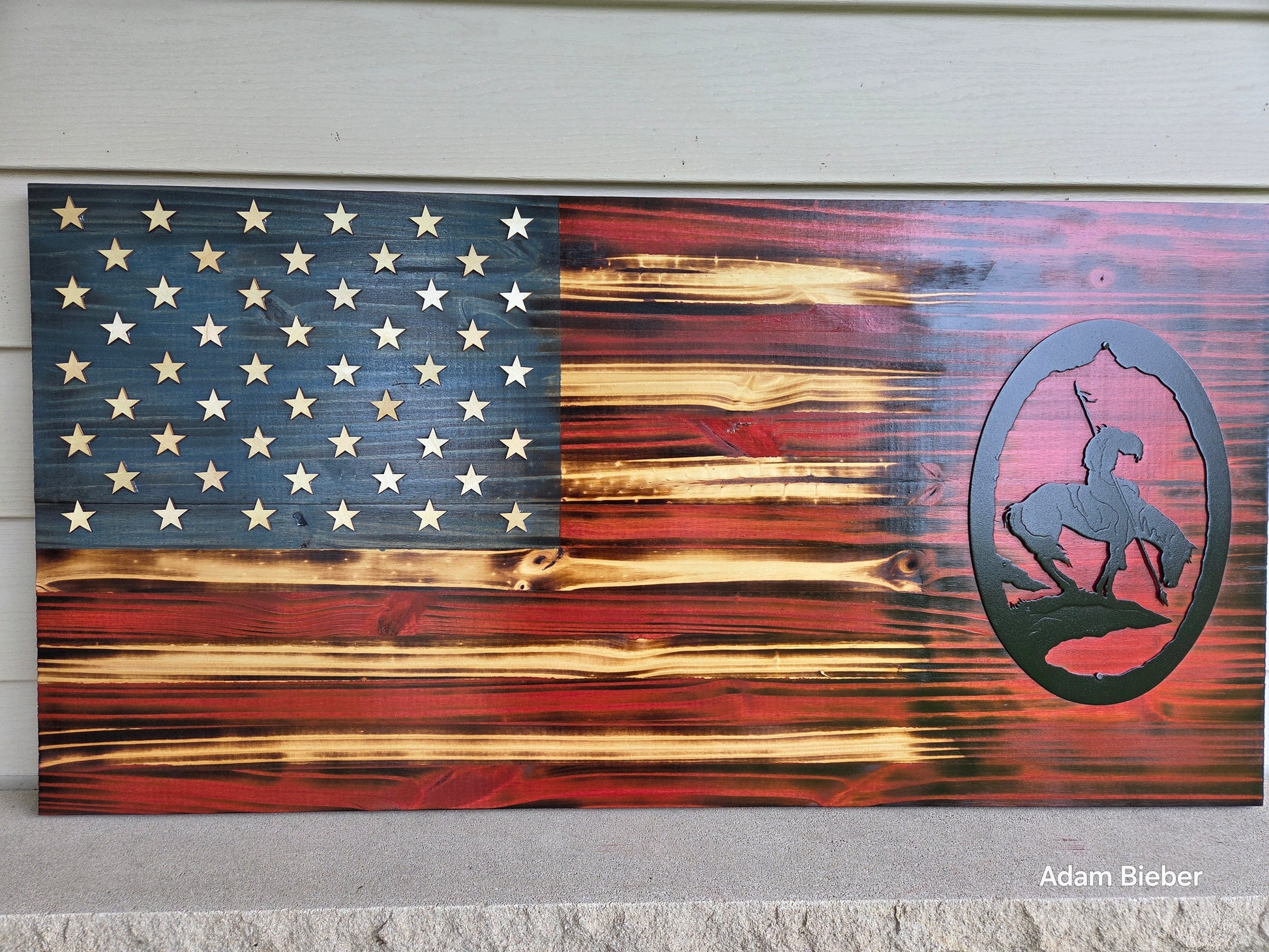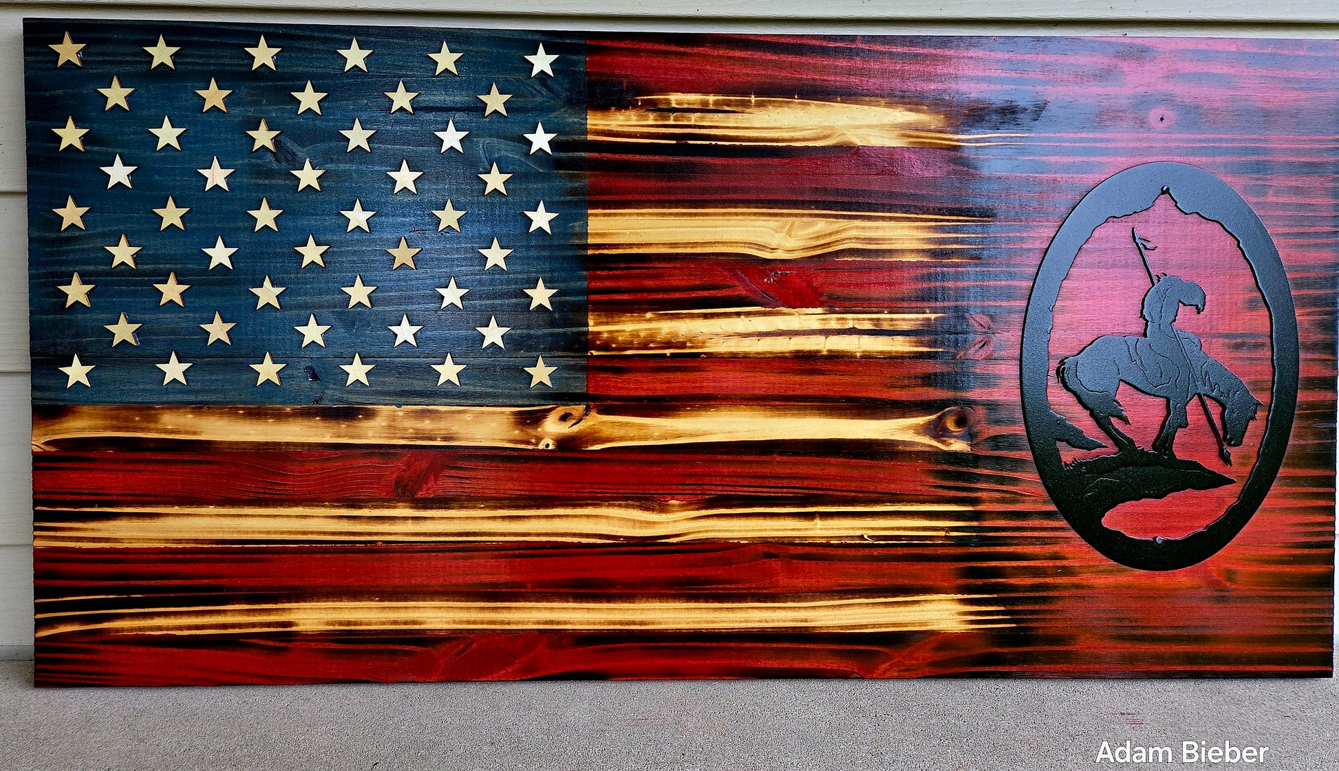 This custom wood flag comes in one size, 19" x 36". It comes ready for display inside or outside. If displayed outside it needs to be under a roof-line. It comes with two coats of sealant on its face.